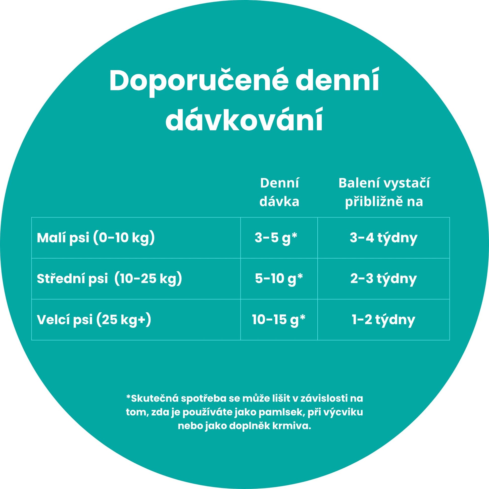 Záleží na velikosti a aktivitě vašeho psa. Používejte je jako doplněk – ne více než 10 % denního příjmu kalorií. Pro výcvik je rozlomte na malé kousky a rozložte je po celý den.